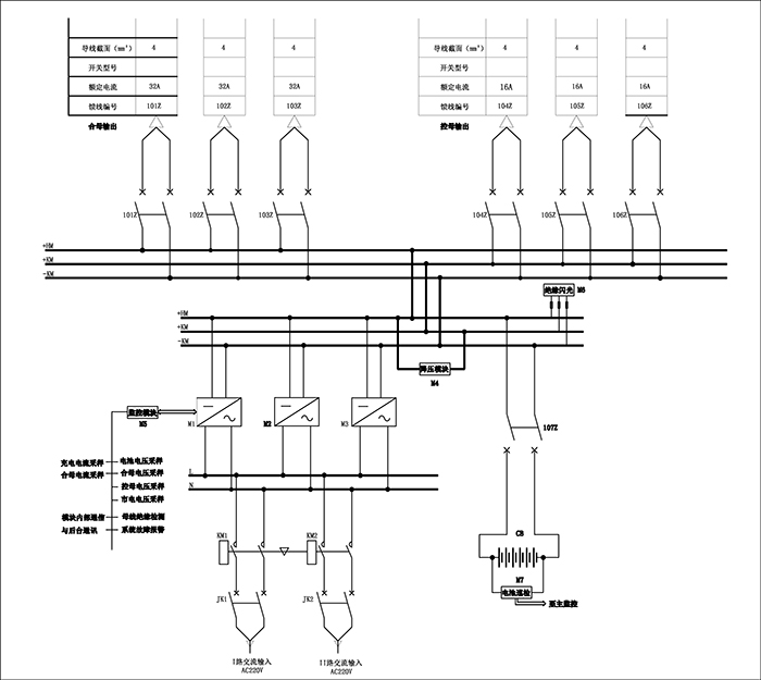 交流配電:兩路交流(單相AC220V)輸入或一路市電(220V)和一路PT(100V)電源輸入,可自動切換互為備用;